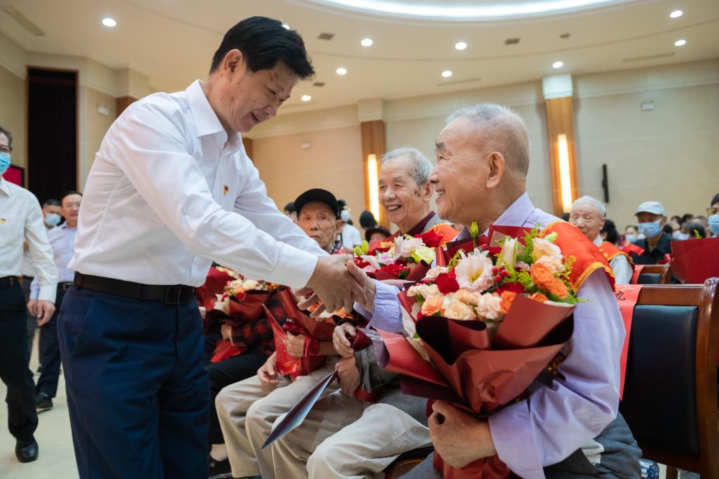 赵凌云在致辞中首先代表学校党委、行政向老寿星、全体离退休教职工致以节日的问候,感谢老同志们为学校发展建设奉献出自己的青春与智慧。他表示,一年来,老同志们秉承着深沉的家国情怀与教育热爱,以主题讲座、口述史等多种方式助力学校落实立德树人的根本任务,让立博体育app官网师生员工备受教育和鼓舞。学校将认真落实习近平总书记对老年人工作作出的重要指示,继续落实好老龄优待政策,维护好老年人合法权益,让老同志共享改革发展成果;时刻保持敬老之心,倾注关爱之情,多做务实之事,推出更多利老、便老的具体措施,当好老同志的贴心人、知心人、暖心人;着重塑造“尊重老同志、爱护老同志、学习老同志”的良好校园文化氛围。赵凌云希望,老同志们一如既往地关心支持学校事业发展,积极参与和指导120周年校庆筹备工作,继续为学校建设教师教育领先的世界一流大学出谋划策,为建设一个更加美好的华师添砖加瓦。