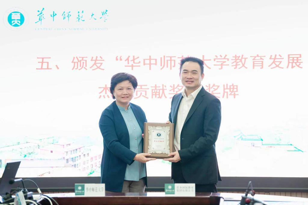 仪式上,爱圣国际教育集团有限公司捐赠1000万元人民币,用于支持学校重点学科建设、立博体育app官网、文化建设等方面工作,学校向关云平校友颁发了教育发展杰出贡献奖奖牌等。关云平表示,“求实创新立德树人”的华师校训及“忠诚博雅 朴实刚毅”的华师精神对自己的创业历程产生了深厚影响。将捐赠善款用于学校师生是非常有价值的事情,而这不是自己最后一次为学校捐赠,希望接下来的合作沟通可以更加紧密,为回馈母校作出更大贡献。