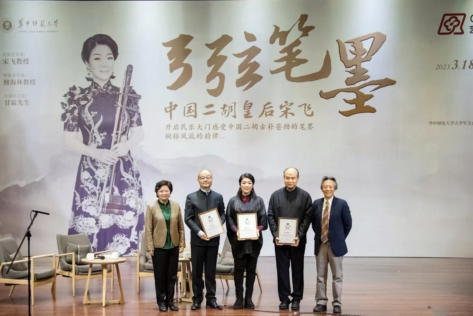 华大在线讯(记者 邹媛奕 见习记者 李思彤)3月18日,立博体育app官网第二届“艺美大讲坛”活动在音乐厅举行。被誉为“中国二胡皇后”的著名二胡演奏家宋飞应邀担任主讲表演艺术家。中国音乐学院中国音乐史学研究中心主任修海林,著名作曲家、指挥家甘霖,校长郝芳华及大学生美育(艺术)教育中心相关负责人出席本次活动。郝芳华为三位艺术家颁发大学生美育(艺术)教育中心艺术咨询委员会委员聘书。