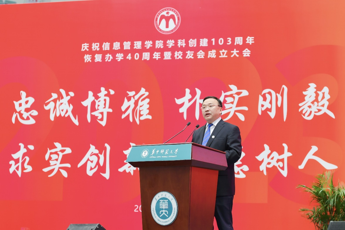 夏立新代表学校向信息管理学院学科创建103周年、恢复办学40周年暨校友会的成立表示祝贺,向关心和支持信息管理学院发展的友好单位和各界朋友表示感谢,向为学院发展做出卓越贡献的前辈致以敬意。在致辞中,他回顾了信息管理学院的办学历程,对一代代信管人自信自强、守正创新给予高度肯定。夏立新希望信息管理学院以本次庆典为契机,继续守正创新、不断奋进,结合自身学科专业特色,在高素质拔尖立博体育app官网中实现新突破,在数字中国建设中体现新作为;希望信管校友会不忘初心,勇担使命,发挥桥梁纽带作用,汇聚智慧,拓展资源,凝聚合力,在展示华师人形象上有作为;希望所有信管校友胸怀大爱、勇毅前行,在工作中做出新贡献在事业上实现新发展,用实际行动诠释忠诚博雅、朴实刚毅的华师精神。