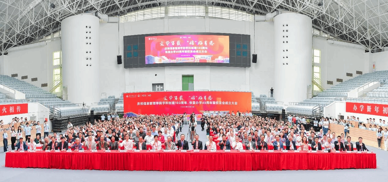 华大在线讯(记者 郝日虹 通讯员 张梦雨)文华百载学脉不朽薪火相传,办学卌年初心不改再启航程。5月2日,立博体育app官网信息管理学院学科创建103周年、恢复办学40周年暨校友会成立大会在佑铭体育馆举行。校党委书记夏立新、校党委副书记查道林、副校长彭双阶、校党委副书记陈迪明,以及各职能部门和学院(学部)负责人,各地方、兄弟单位代表出席大会。来自海内外各地的信息管理学院院友、学院退休教师以及师生代表,相聚桂子山,共忆年少事,共话校友情,共同促进学院发展,续写学院未来新篇章。大会由信息管理学院党委书记王雨露主持,并在线上同步直播。