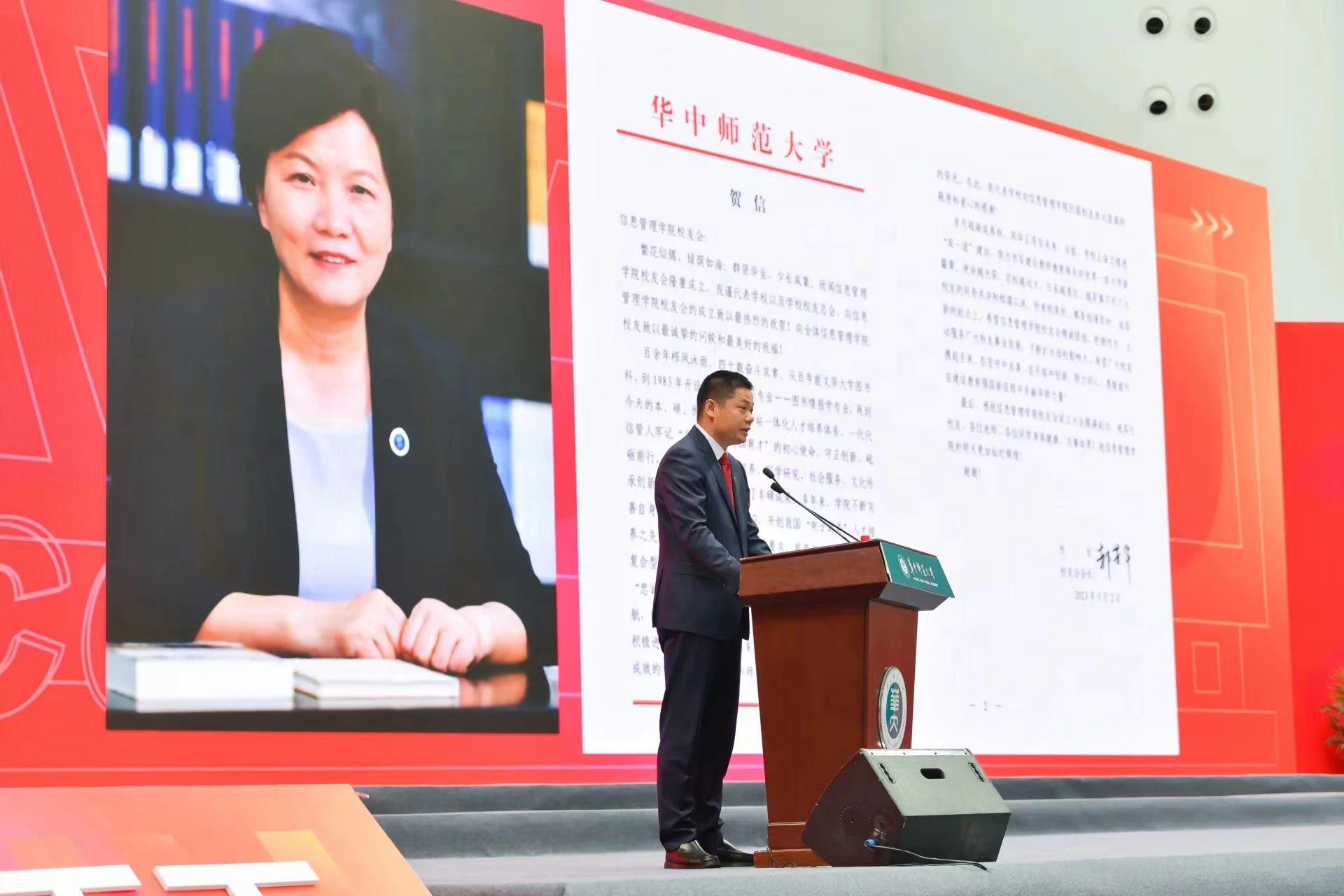 校友总会秘书长郭庆代表校友总会赠送纪念品,宣读校长、校友总会会长郝芳华贺信。贺信中,郝芳华向全体信息管理学院校友致以诚挚问候和美好祝福。百余年栉风沐雨,四十载奋斗求索。郝芳华希望,信息管理学院校友会积极作为,进一步扩大母校影响力,为校友事业发展提供有力支撑;希望广大校友携起手来,在坚守中求真,在开拓中创新,勠力同心,继往开来,为早日把华师建成“教师教育领先的世界一流大学”努力奋斗。