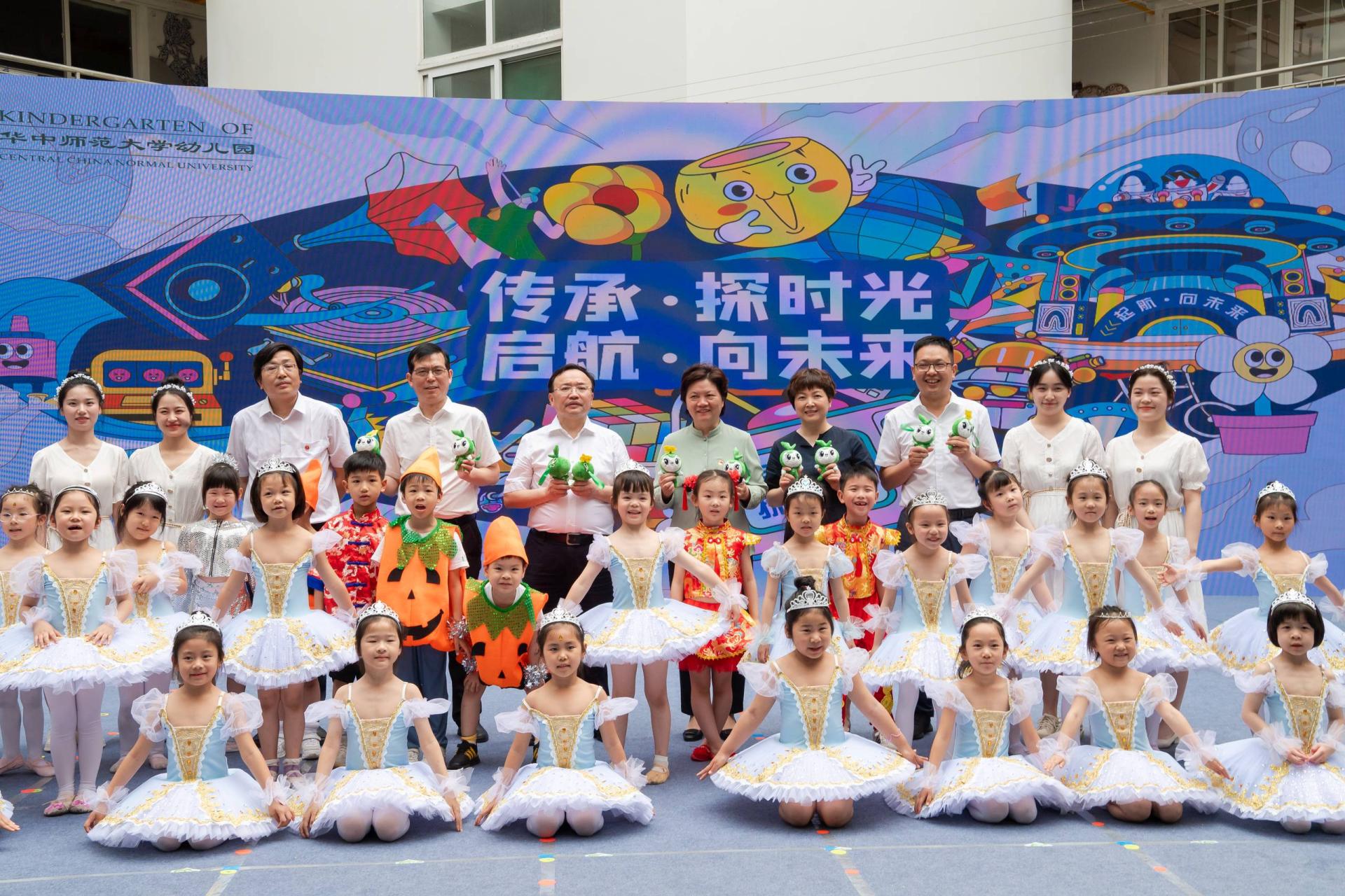 夏立新、郝芳华等又前往华师附属小学。华师附小大队委们为到访的各位领导带上了鲜艳的红领巾,邀请他们观看附属小学六一庆典彩排。校领导们登台与小演员们亲切交谈,赠送了精心准备的节日礼物,表达了对孩子们未来美好人生的无限期许。