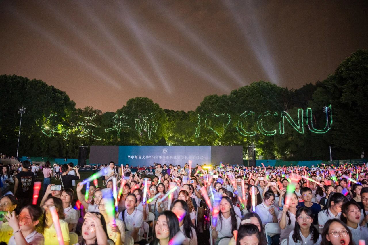 毕业组歌中,《最初的梦想》带领毕业生们重温青葱时光;《突然好想你》再次引起全场大合唱,粉色的舞台灯光更显离愁别绪;HANA乐队的《再见,再见》将舞台重新点燃,伴随着“再见再见再见……”的歌声,“我爱华师,I?CCNU”的投影出现在观众席背后,观众纷纷拍照留念。