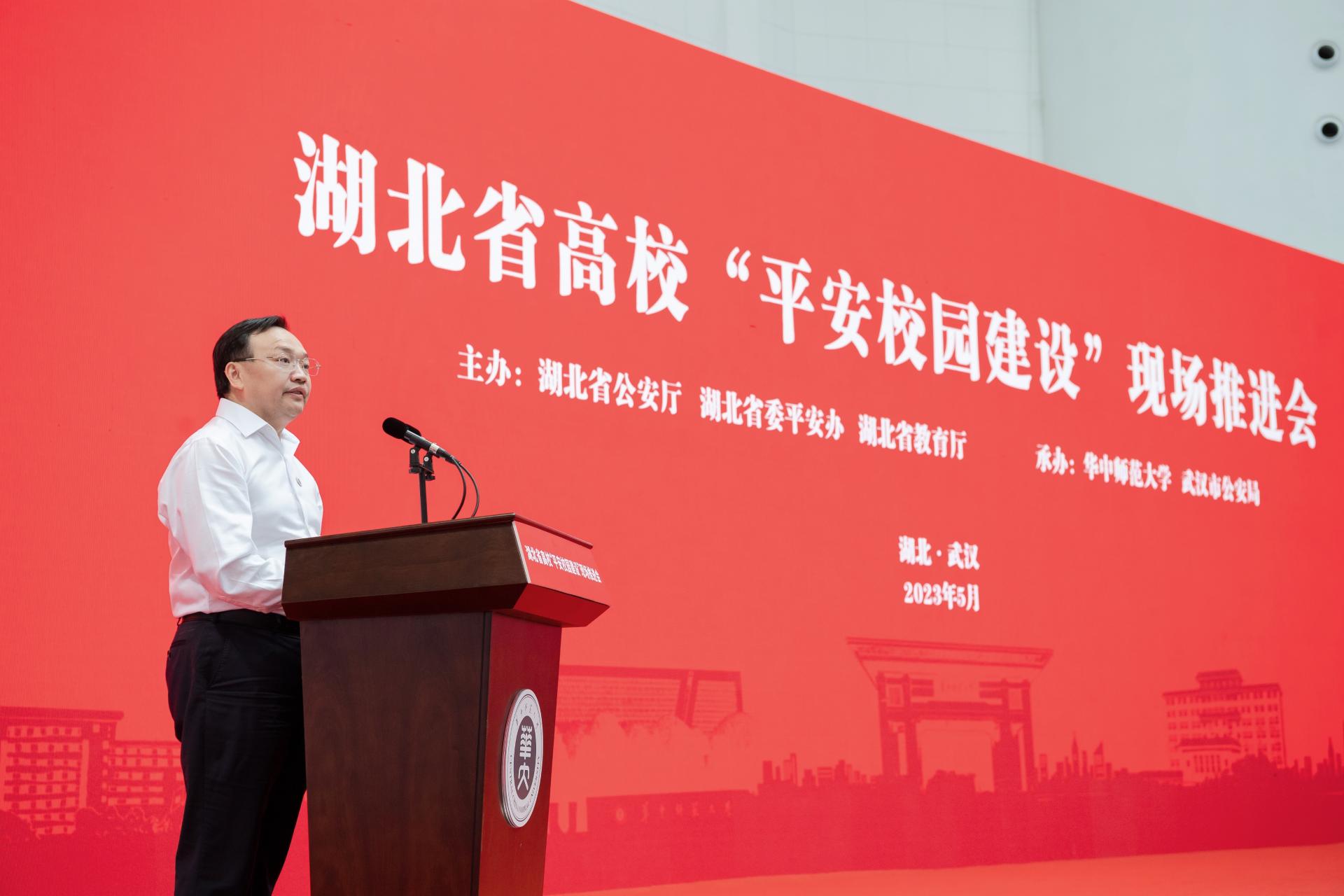 华大在线讯(记者 华轩)近日,全省高校“平安校园建设”现场推进会在立博体育app官网佑铭体育馆举行。湖北省副省长、公安厅厅长徐文海,省委政法委副书记肖红梅,省教育厅党组书记、厅长周静,省公安厅党委副书记、副厅长吴德清,武汉市副市长、公安局局长杨彪出席。省直单位、全省高等学校以及市、州、直管市公安局相关负责人参加。校党委书记夏立新作致辞发言,校长郝芳华作经验交流。