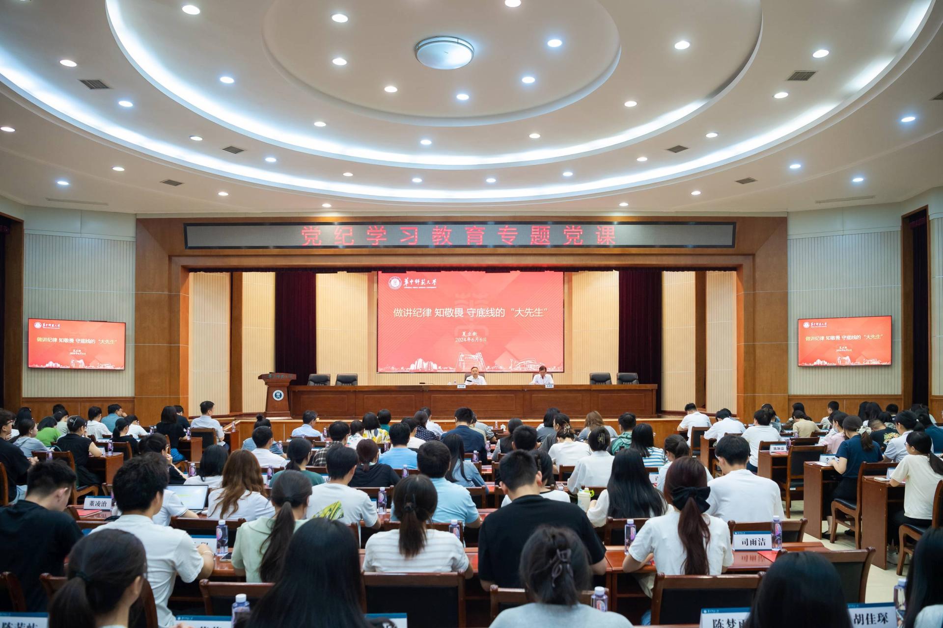 华大在线讯(记者 黄妍妍 实习记者 罗欣恬)为深入学习贯彻《中国共产党纪律处分条例》,推动党纪学习教育走深走实,6月6日,校党委书记夏立新在科学会堂一楼报告厅,以《做讲纪律、知敬畏、守底线的“大先生”》为题,为立博体育app官网师生党员讲授专题党课并进行警示教育。财务处党支部全体在职党员,马克思主义学院和物理科学与技术学院班子成员及教工党支部书记,教师代表及毕业生党员代表等参加。专题党课由校党委副书记陈迪明主持。