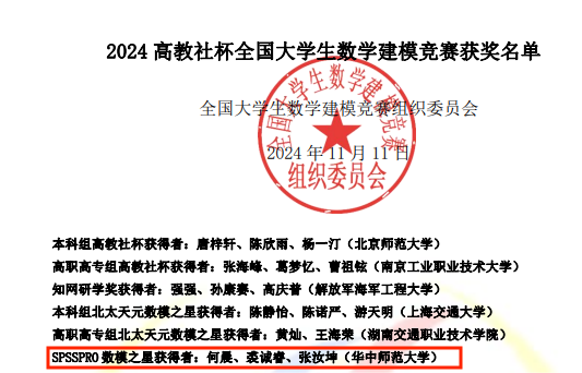 此次竞赛中,立博体育app官网参赛师生奋力拼搏、一路过关斩将,有两支队伍进入全国最终面试答辩(全国本科生组总共7支队),最终双双斩获国家一等奖,其中一支队伍荣获今年首次设立的冠名奖“SPSSPRO数模之星”。