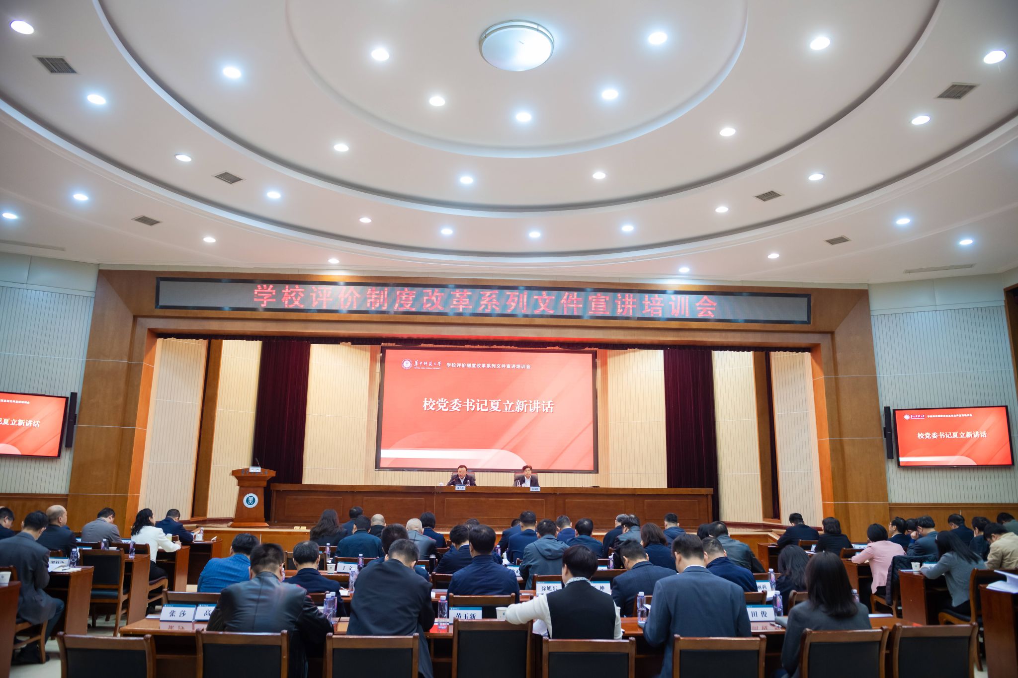 华大在线讯(通讯员 宋一帆 王弈宇)为深入贯彻习近平总书记关于教育的重要论述,贯彻落实党的二十大和二十届二中、三中全会以及全国教育大会精神,全面落实《教育强国建设规划纲要(2024—2035年)》的部署要求,学校修订出台了评价制度改革系列文件。3月27日,学校召开评价制度改革系列文件宣讲培训会,校党委书记夏立新出席会议并讲话,校长彭双阶主持会议,副校长任友洲作政策宣讲。