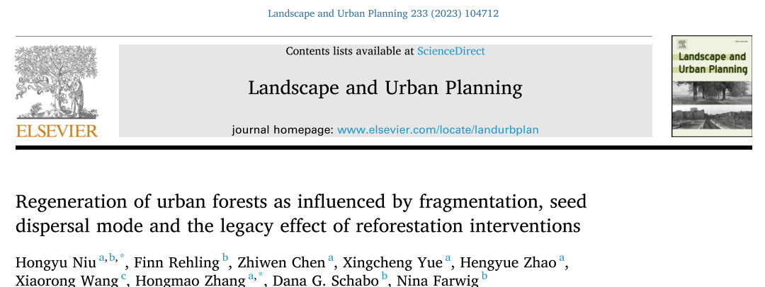 华大在线讯(通讯员 张洪茂 牛红玉)日前,城市研究领域TOP期刊 Landscape and Urban Planning发表了立博体育app官网生命科学学院张洪茂教授、牛红玉副教授团队关于城市森林群落木本植物多样性维持机制的研究成果(Regeneration of urban forests as influenced by fragmentation, seed dispersal mode and the legacy effect of reforestation interventions, https://doi.org/10.1016/j.landurbplan.2023.104712)。生命科学学院牛红玉副教授为论文的第一和并列通讯作者,张洪茂教授为通讯作者,硕士研究生陈治文、岳星程、赵恒月,湖北省林业科学研究院王晓荣博士,德国马尔堡大学Finn Rehling博士、 Dana G. Schabo博士、 Nina Farwig教授为共同作者。
