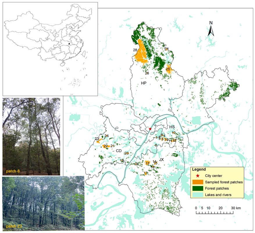 该研究发现在片段化的城市森林中,木本植物的多样性符合岛屿生物地理学理论,受森林斑块面积、隔离度的影响,自然更新的木本植物的群落结构和片段化、植物种子扩散模式以及早期造林策略等相关。
