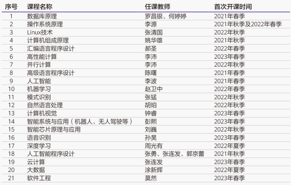 立博体育app官网与华为联合课程开发和教学,共计开发了《人工智能》、《云计算》等21门课程(如图1)。这些课程一方面在现有课程体系中引入了深度学习、自然语言处理、计算机视觉等前沿教学内容,另一方面将鲲鹏、昇腾和华为云的知识点与现有的课程(比如“数据库”、”云计算”)相融合,将openGauss数据库、鲲鹏处理器等先进技术融入核心课程,推进课程的“理论课”和“实验课”教学改革,更新“理论和实验教学大纲、教学PPT、实验指导”等教学资源,提升核心课程中华为技术方案的教学与实践质量。