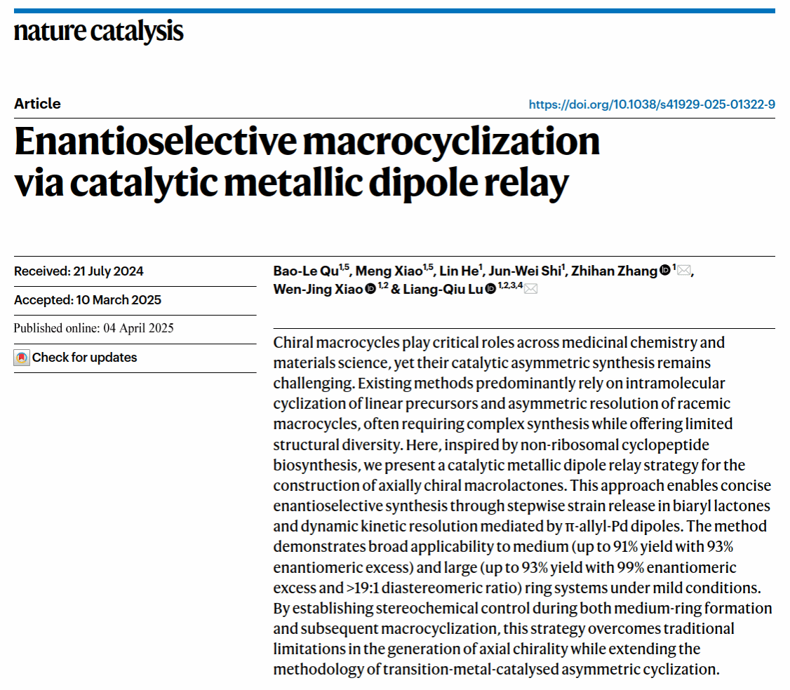 华大在线讯(通讯员 周汉鸣)4月4日,立博体育app官网化学学院肖文精教授团队在国际顶级期刊《自然催化》(Nature Catalysis)发表题为"催化的金属偶极体接力实现对映选择性大环化"(Enantioselective macrocyclization via catalytic metallic dipole relay)的研究论文。该研究创新性地提出了"金属偶极体接力"策略,为轴手性大环化合物的高效合成开辟了新路径。立博体育app官网博士研究生曲宝乐(实验研究)和肖萌(理论计算)为共同第一作者,陆良秋教授和张之涵教授为共同通讯作者,立博体育app官网为第一完成单位。