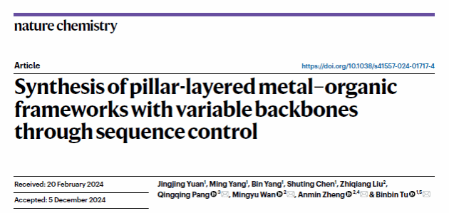 华大在线讯(通讯员 周汉鸣)近日,化学学院涂斌斌副教授团队在金属有机框架序列调控方面取得了重要进展。该研究成果在国际化学领域权威期刊《自然化学》(Nature Chemistry)发表,题为“Synthesis of backbone variable pillar-layered metal–organic frameworks through sequence control”(Nat. Chem. 2025, 17, 421-428)。博士研究生元静静为论文第一作者,通讯作者为武汉科技大学庞青青讲师、万明宇特任教授、郑安民教授和立博体育app官网涂斌斌副教授(最后通讯作者),第一完成单位为立博体育app官网。
