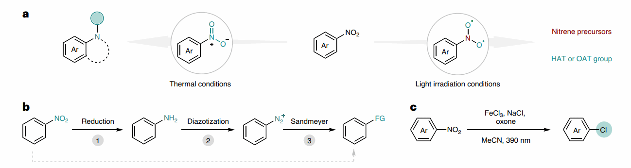 硝基(杂)芳烃是有机合成中最常用的化学原料之一,是生产药物、农用化学品和功能材料的中间体。在热反应条件下,硝基芳烃可以转化为各种含氮化合物;在光照的条件下可以作为氢原子转移试剂,氧原子转移试剂,甚至作为氮宾前体,实现热反应中无法实现的反应。虽然这些光照下的转化是在温和的条件下进行的,减少了对苛刻试剂和高温的需求。但在直接的取代反应中,由于共轭效应,目前硝基难以作为离去基直接离去。而化学家经常使用还原、重氮化和Sandmeyer反应多步反应来间接实现硝基芳烃的脱硝基转化。该方法虽然有效,但存在原子经济性差、产生过量废物和爆炸性重氮盐中间体的问题。因此,硝基芳烃的一步脱硝基官能团化值得被进一步探索。